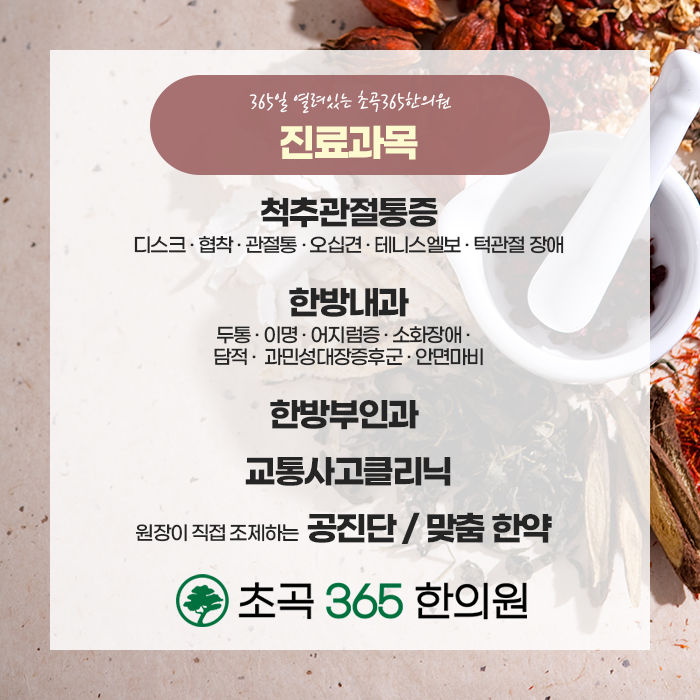 같은 증상이나 진단이라도 환자에 따라서 증상, 원인, 체질이 다르기 때문에 치료 대처법도 달라질 수 있습니다. 증상, 원인, 개인 체질에 맞춰진 1:1 처방을 만나보실 수 있는 초곡 365한의원! 교통사고에 대한 풍부한 임상 경험을 지니고 있으며 신체의 구조적 문제나 기능적 문제를 바르게 파악하고 신속하고 안정적으로 건강을 회복하실 수 있도록 한 분 한 분 정성을 다해 진료하고 있습니다. 평일에는 야간 진료가 가능하고, 365일 진료가 가능합니다. 또한 입원실도 준비되어 있어서 편안하게 치료를 받으실 수 있습니다.