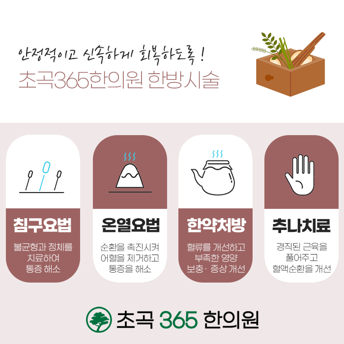 다양하게 발생하는 교통사고 후유증은 증상과 원인, 개인 체질에 따라서 종합적으로 진단하고 체계적으로 치료가 이루어져야 합니다. 포항한의원 에서는 진단을 꼼꼼하게 하고 숙련된 한방 시술을 진행합니다. 침 치료는 지속적인 자극을 주어 통증을 개선해주고 약침은 염증을 물리적으로 다스립니다. 또한 온열치료, 부항, 추나치료, 한약 처방 등이 병행되고 있습니다. 한약은 혈액순환 개선을 도와주고 담음, 어혈, 염증 등 노폐물을 배출해주며 건강을 높여줍니다. 초곡365한의원의 한약은 식약처에서 인증받은 약재만을 사용하고 위생적으로 관리합니다.