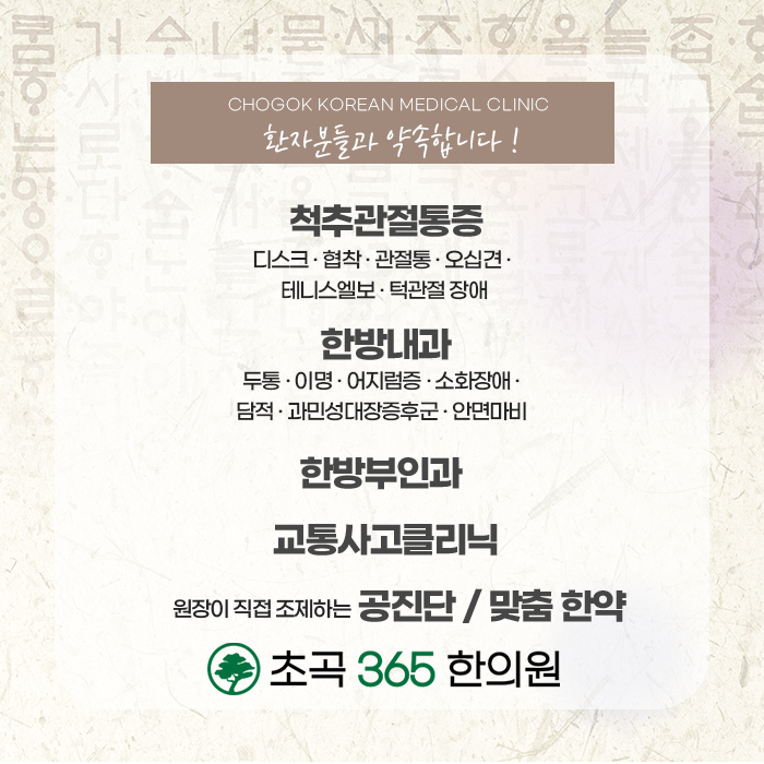 개인 몸 상태에 따라서 종합적으로 진단하고 체질에 따라서 처방하는 포항 유산한약 ! 식약처로부터 인증을 받은 한약재만을 사용하고 위생적으로 관리하며 부작용을 최소화 합니다. 내게 맞는 처방을 통해서 증상을 개선하고 몸 상태를 다스리고 후유증을 막아줍니다. 또한 체질을 변화시켜주어 건강을 되찾으시도록 도와드립니다. 유산 후에는 마음의 안정을 찾는 일도 중요합니다. 스트레스를 줄이고 심신의 안정을 두루 살펴드리는 초곡365한의원! 대를 잇는 처방을 만나보실 수 있으며 365일 문이 열려있으니 편안하게 내방하여 주시길 바랍니다.