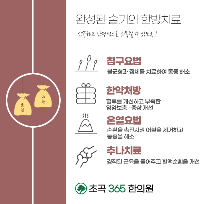 수술 후에는 통증이 지속되어 고생하시는 분들에게도 포항 무릎치료 한의원 도움을 받으실 수 있습니다. 조직 유합의 과정에서 유발될 수 있는 통증을 개선하고 관절 주변의 근육을 튼튼하게 강화하여 유연하고 편안하게 동작하고 통증을 다스리며 회복에 도움을 받을 수 있습니다. 이러한 과정으로 편하게 보행할 수 있도록 도와드립니다. 대를 잇는 처방을 만나보실 수 있는 초곡365한의원 한방 케어를 통해서 무릎 상태를 잘 관리하시길 바랍니다.