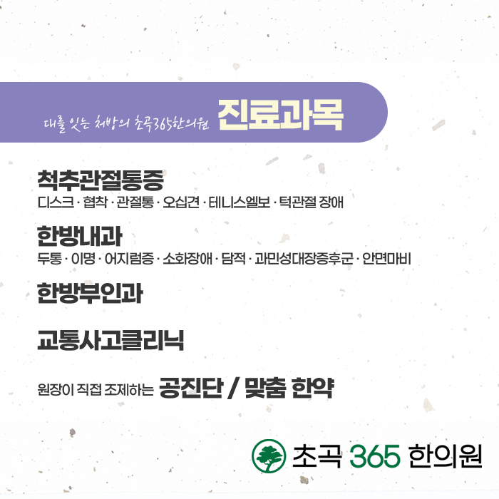 비틀어지고 바르지 못한 경추 및 척추로 인한 통증이나 문제점을 개선하고 신속하고 안정적으로 회복될 수 있게 도와드립니다. 대를 잇는 처방을 바탕하고 있는 초곡365한의원의 도움을 받아서 비틀어지고 불균형한 신체를 바로 잡아주고 제기능을 회복하여 정상적인 범위로 되돌려야 합니다. 365일 진료가 가능하오니 편안한 시간에 내방하여 진료받아보시길 바랍니다.