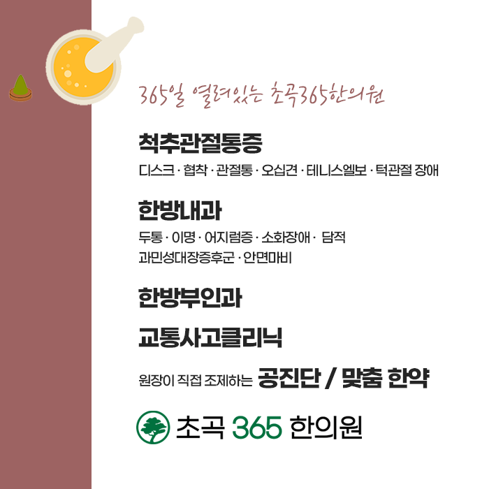 신체의 관절은 평소에 올바른 자세와 생활 습관을 유지한느 것이 무엇보다 중요합니다. 그렇지 않을 경우 또 다시 관절이 어긋날 수 있습니다. 초곡365한의원에서는 올바른 생활 습관 코칭까지 더하여 재발이 되지 않도록 도와드리고 있습니다. 신체의 불균형을 바로 잡고 중심을 바로 잡는 치료를 통해서 개선된 상태가 계속해서 유지될 수 있도록 관리하고, 체계적으로 도와드리고 있습니다. 정밀한 검진을 통하여 근본적인 원인을 파악하여 접근하는 치료를 확인해 보실 수 있습니다. 풍부한 임상 경험과 노하우, 숙련된 한방 시술을 통해서 신체의 불균형을 회복하여 드리고 있는 초곡365한의원 ! 올바른 자세와 신체로 회복하여 통증을 개선해주고 건강을 회복하실 수 있도록 도와드리고 있습니다. 365일 진료가 가능하오니 편안한 시간에 내원하여 진료를 받아보시길 바랍니다.
